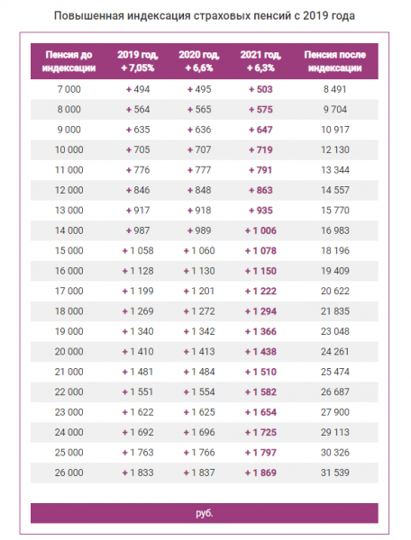 С 1 января страховые пенсии неработающих пенсионеров индексируются на 6,3%, что выше показателя прогнозной инфляции по итогам 2020 года. В результате индексации страховая пенсия по старости большинства неработающих пенсионеров увеличивается не меньше чем на тысячу рублей в месяц, а ее средний размер – до 17,5 тыс. рублей.