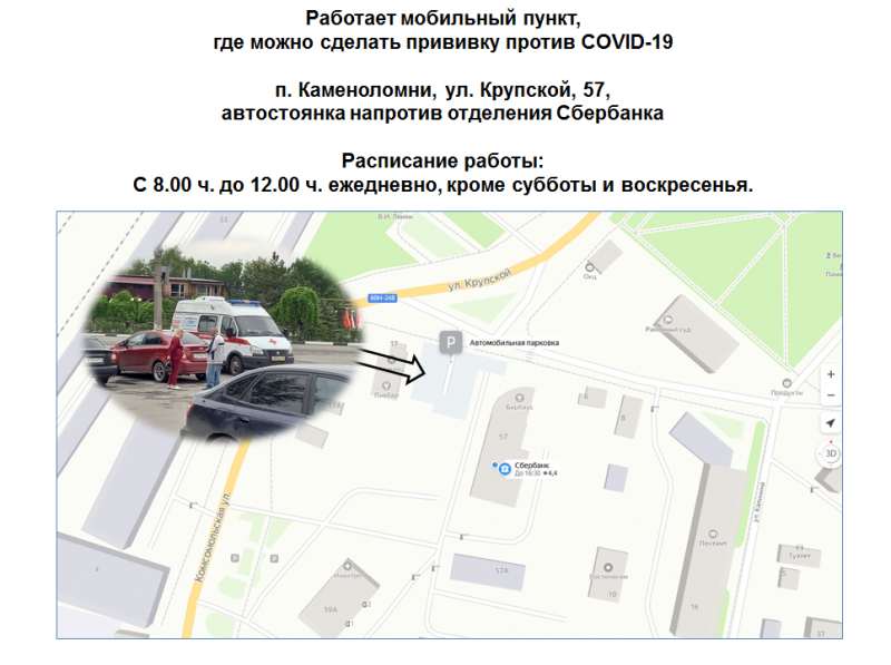 Вы можете провакцинироваться против Covid-19 в мобильном пункте, расположенном у здания Сбербанка (п. Каменоломни, ул. Крупской, 57).