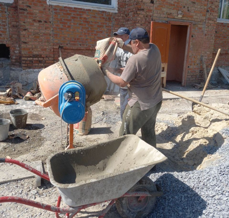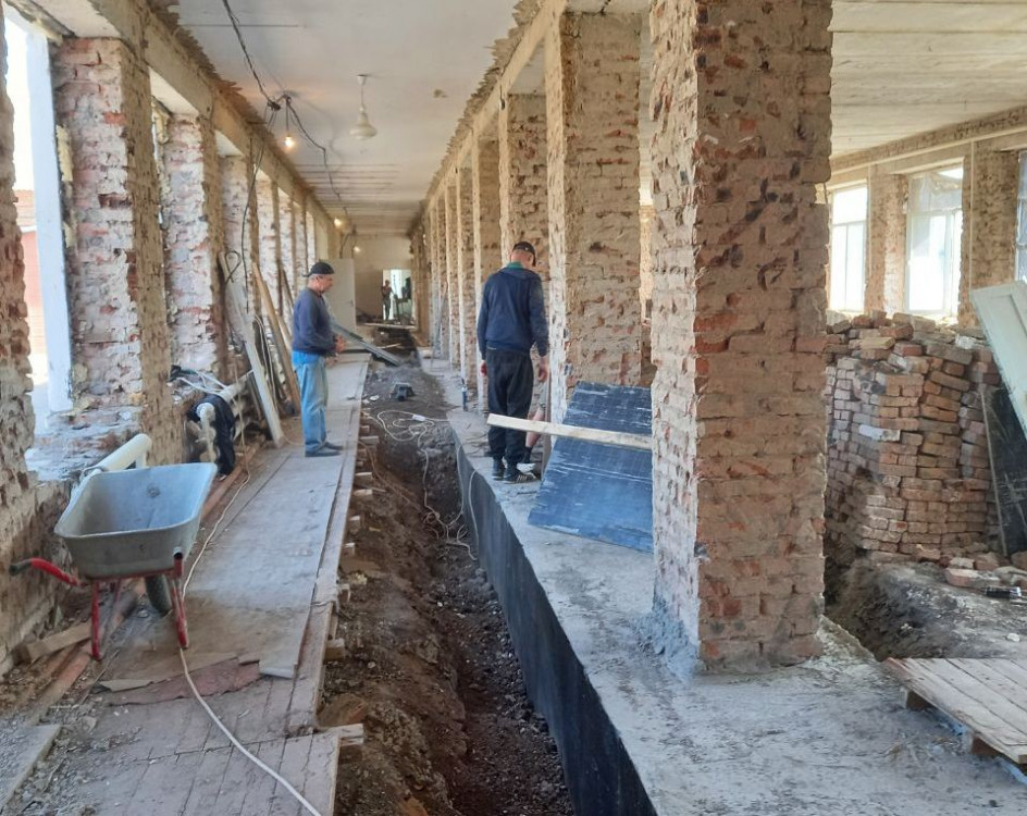 На сегодняшний день здесь готовятся новые места для заливки бетоном, снимается опалубка, проводятся работы во входной зоне, демонтируются окна, готов фундамент в спортивном зале школы.