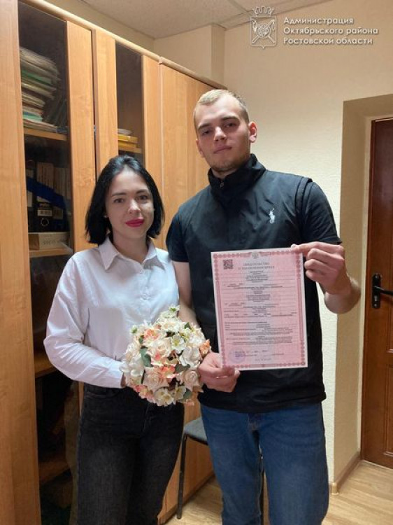 В этот день отдел ЗАГС Администрации Октябрьского района зарегистрировал три семейные пары. На фото – молодые супруги Егор и Евгения. Она – из Октябрьского района, а молодой человек из Оренбурга, но расстояние не стало препятствием для создания новой семьи.