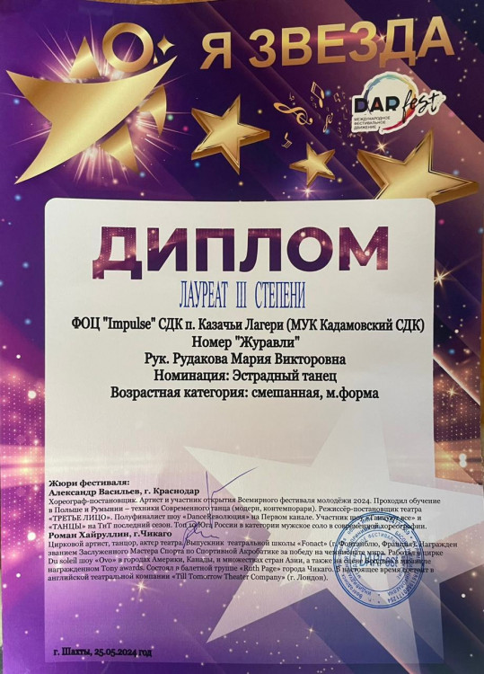 Хореографический коллектив СДК п. Казачьи Лагери «Импульс» (руководитель М. Рудакова) занял 3 место в XXV Международном многожанровом фестиваль-конкурсе - «Я звезда!».