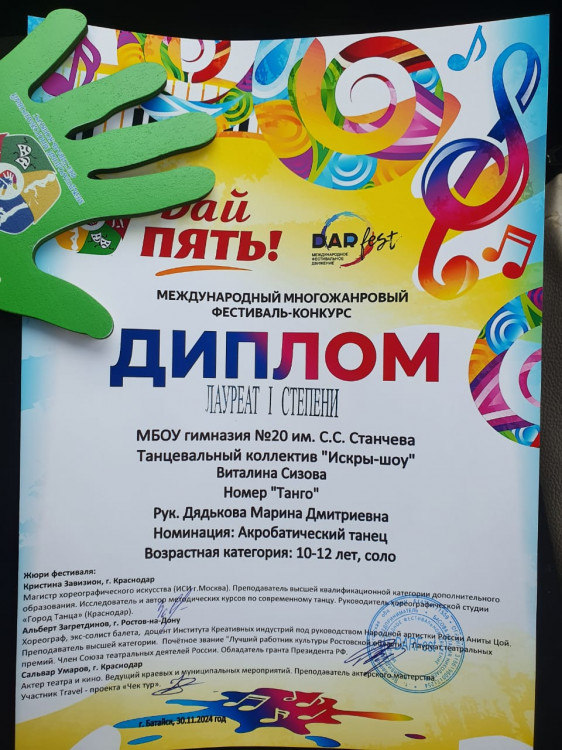 30 ноября 2024г. солистка танцевального коллектива "Искры-шоу" гимназии 20 им. С.С. Станчева (руководитель - педагог дополнительного образования М. Д. Дядькова) - Виталина Сизова, приняла участие в Международном многожанровом фестивале-конкурсе "Дай пять!" и стала Лауреатом 1 степени!