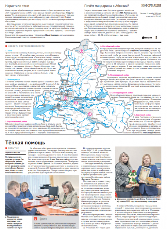 Специально для депутата местные ребята смастерили символ 2025 года по восточному календарю – зеленую деревянную змею. В знак благодарности они еще создали пейзажную декоративную картину. Все новогодние поделки Елене Теплинской вручила начальник отдела образования администрации Октябрьского района Анна Тараско. По ее словам, педагоги, родители и ученики очень благодарны депутату за замену котла в школе №5 имени А.О. Хорошевской, которая находится в поселке Новозарянский. Теперь в зимний период в учреждении не будет проблем с отоплением. Не страшны морозы и детским садам №№7, 9, 48 хутора Маркин, станицы Заплавская и поселка Новозарянский. Здесь тоже при поддержке депутата Заксобрания заменили котлы для отопительных систем дошкольных учреждений. – Благодаря активному общению и доверительным отношениям с жителями вместе можно сделать район еще лучше и комфортнее, – подчеркнула принимавшая участие в приеме граждан глава администрации Октябрьского района Людмила Овчиева.