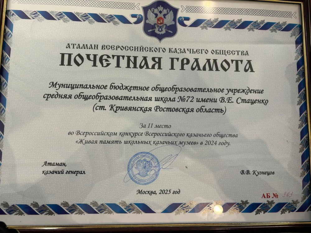 Эти учреждения заняли почётное второе место во Всероссийском конкурсе Всероссийского казачьего общества на тему «Живая память школьных казачьих музеев в 2024 году».