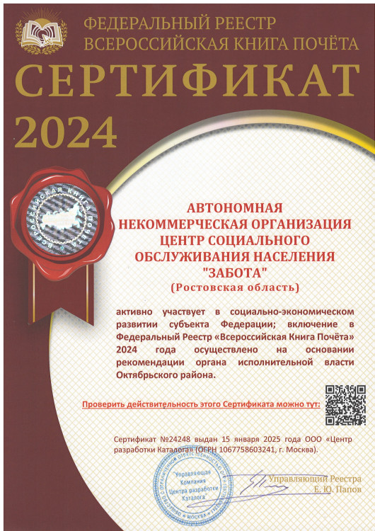 АНО ЦСОН «Забота» выдан сертификат Федерального Реестра Всероссийская Книга Почета 2024 года и изготовлен памятный знак.