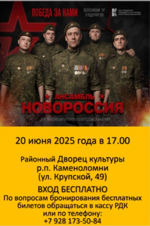 20 июня в Районном Дворце культуры по адресу: п. Каменоломни, ул. Крупской, 49, состоится концерт ансамбля "Новороссия".