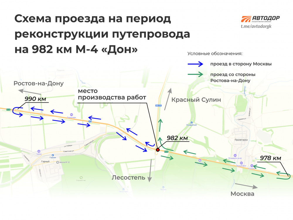 - Для выезда из г. Красный Сулин в северном направлении необходимо использовать разворот на 987-ом км М-4.
