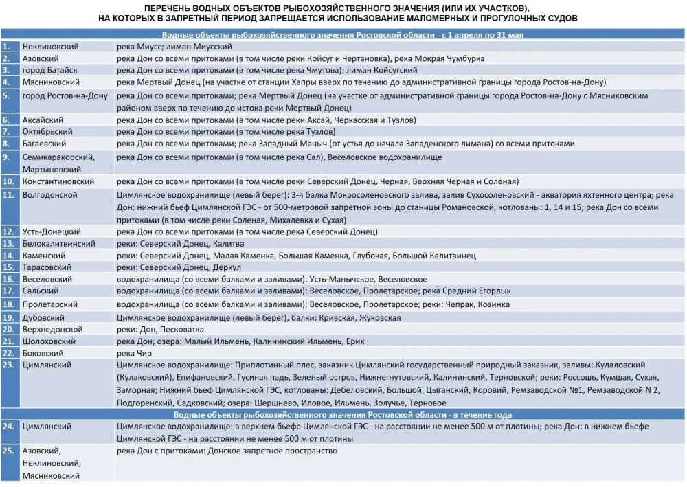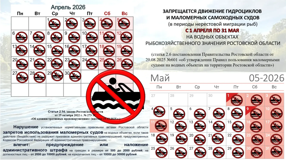 С 1 апреля по 31 мая в Ростовской области действует запрет на движение маломерных моторных судов (моторные лодки, катера, гидроциклы) в период нереста рыбы.