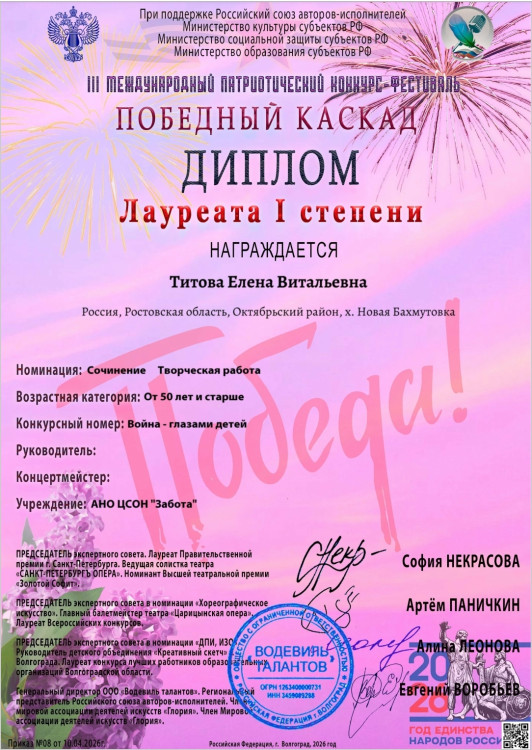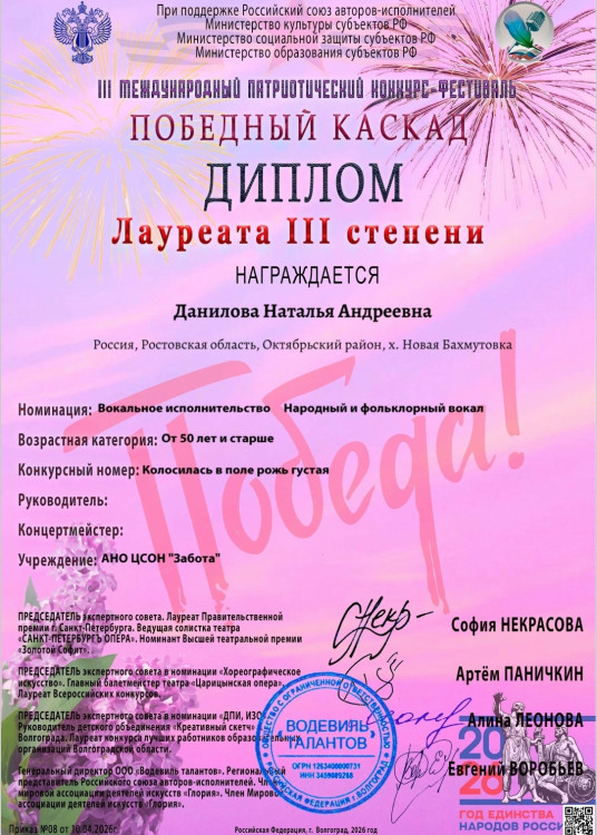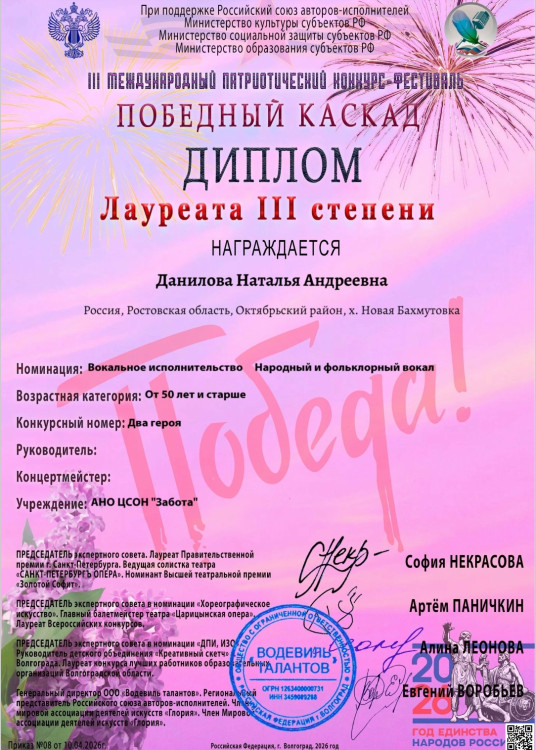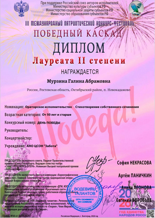 Социальный работник ОСО на дому № 3 Титова Е.В. и получательницы социальных услуг Данилова Н.А. и Мурзина Г.А. приняли участие в III Международном патриотическом конкурсе-фестивале «Победный каскад».