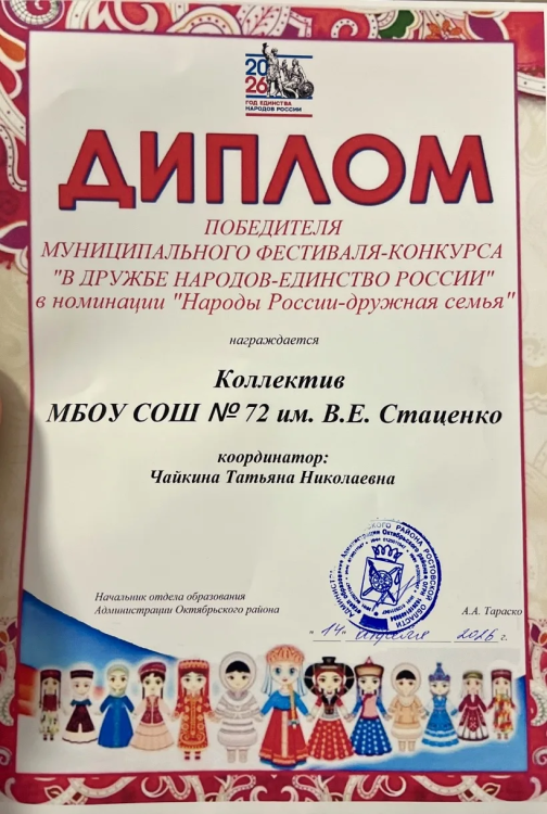 Поздравляем творческий коллектив школы №72 и их талантливого наставника Т. Н. Чайкину! Такие конкурсы не просто выявляют лучших, они помогают укреплять единство народов и бережно хранить традиции нашей многонациональной страны.