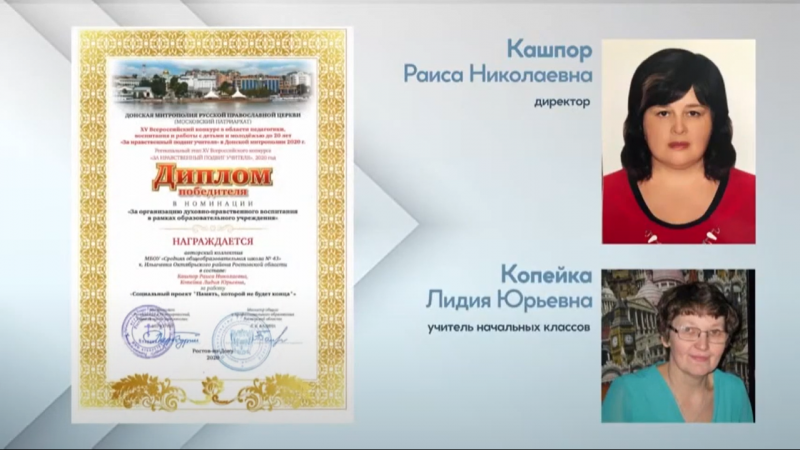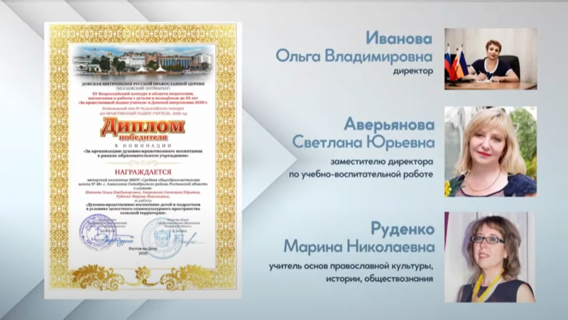Дипломами победителей в номинации «За организацию духовно-нравственного воспитания в рамках образовательного учреждения» регионального этапа XV Всероссийского конкурса в области педагогики, воспитания и работы с детьми и молодёжью до 20 лет «За нравственный подвиг учителя» в 2020 году награждены авторские коллективы: