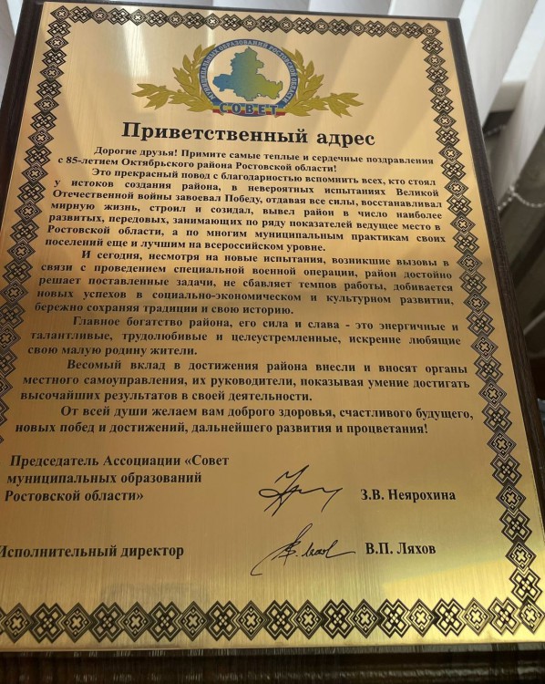 В рамках празднования 85-летнего юбилея Октябрьского района решением правления ассоциации «Совет муниципальных образований Ростовской области» были вручены наивысшие награды за заслуги в развитии муниципального образования Председателю Собрания депутатов-главе Октябрьского района Е.П.Луганцеву и главе Администрации Октябрьского района Л.В.Овчиевой.