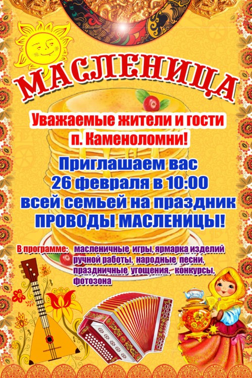 26 февраля с 10.00 часов на площади в поселке Каменоломни перед зданием Районного дворца культуры будут работать торговые точки, выставки изделий прикладного искусства, интерактивные точки от поселений.