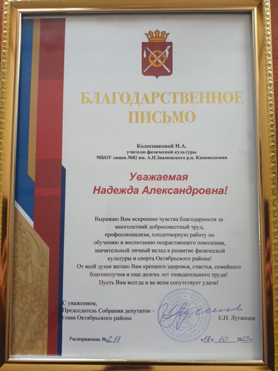 Заведующая сектором по организационной и правовой работе Собрания депутатов Октябрьского района Наталья Александровна Скорая в торжественной обстановке вручила благодарственное письмо от имени Председателя Собрания депутатов-главы Октябрьского района Евгения Луганцева "За многолетний добросовестный труд, профессионализм, плодотворную работу по обучению и воспитанию подрастающего поколения, значительный личный вклад в развитие физической культуры и спорта Октябрьского района!".
