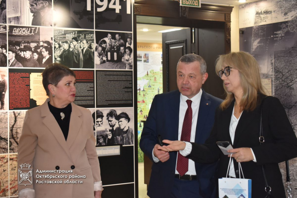 Первый заместитель Губернатора Ростовской области Игорь Гуськов вместе с министром культуры Ростовской области Анной Дмитриевой и главой Администрации Октябрьского района Людмилой Овчиевой в рамках проведения расширенного заседания коллегии министерства культуры Ростовской области посетили Краеведческий музей района, расположенный в поселке Каменоломни.