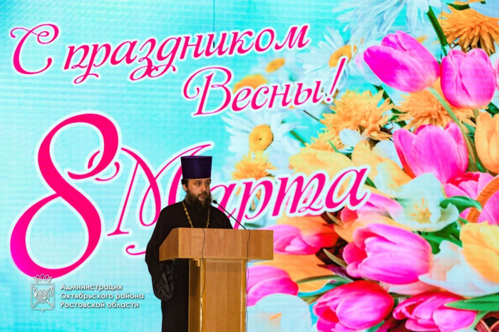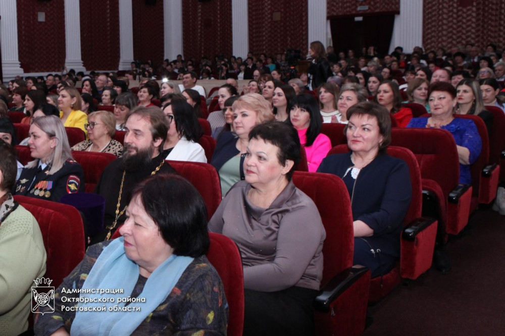 В торжественном мероприятии приняли участие глава Администрации Октябрьского района Людмила Овчиева, заместитель Председателя Собрания депутатов Наталья Злобина, благочинный приходов Александровск- Грушевского и Нижнедонского округов протоиерей Сергий Яценко, женщины Октябрьского района, которые трудятся в сфере культуры, образования, экономической, социальной сферах, многодетные мамы, жены и матери военных.