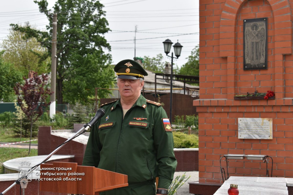 Также к собравшимся обратились заместитель Председателя Собрания депутатов Октябрьского района Наталья Злобина, военный комиссар г. Шахты и Октябрьского района Иван Вансович, председатель представительства РРОИ "Союз Чернобыль" в Октябрьском районе Михаил Харитонов. Протоиерей Сергий Яценко провел панихиду о погибших в катастрофе, после чего участники митинга почтили память погибших минутой молчания и возложили цветы к мемориалу погибших героев.